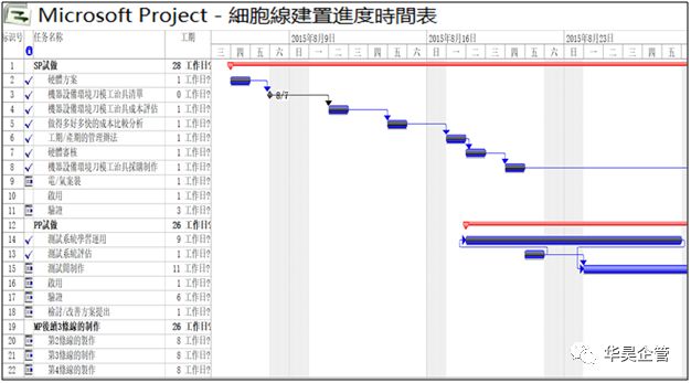 虽然说我们心中有一定成功的把握,但是为了科学及谨慎起见,我们还是先打样加工制作一套给车间装配单位试用。走产品开发流程,经过SP、PP、MP三个阶段验证,导入精益U型滚筒细胞线线体加工制造,并设计《细胞线建置进度时间表》进行进度控管(如图9)。