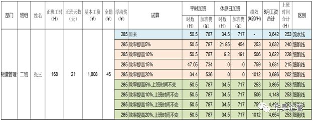 如上图(图16)所示,我们对该公司的工资制度进行了测试,以当年8月份的为例,和原来的流水线相比,效率每提升一个层级,员工的工作时间减少了,但相应的工资并未减少。如果细胞线的员工效率提升20%,工作时间(含平时加班和休息日加班时间)跟以前50.5H一样,员工所得到的工资由原来的3642元提升到了4654元。如果细胞线的员工效率提升20%,工作时间比以前减少,由50.5H减少到34.4H,工作时间缩短了16.1H,员工所得到的工资由原来的3642元变为3686元,收入相当,并未减少,员工就非常乐意。