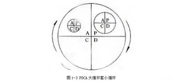 我们每一个人就可以做PDCA一个小循环,每一个班组又有一个中循环,每一个部门又有一个中大循环,整个企业就是个大循环,所以,每一个人、每一个部门都可以做PDCA。